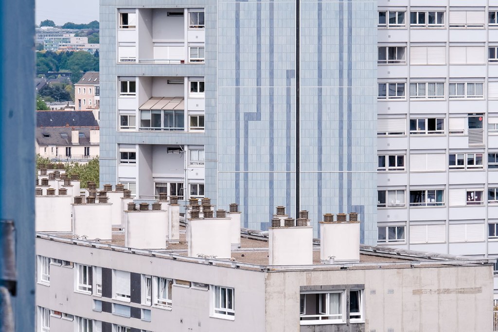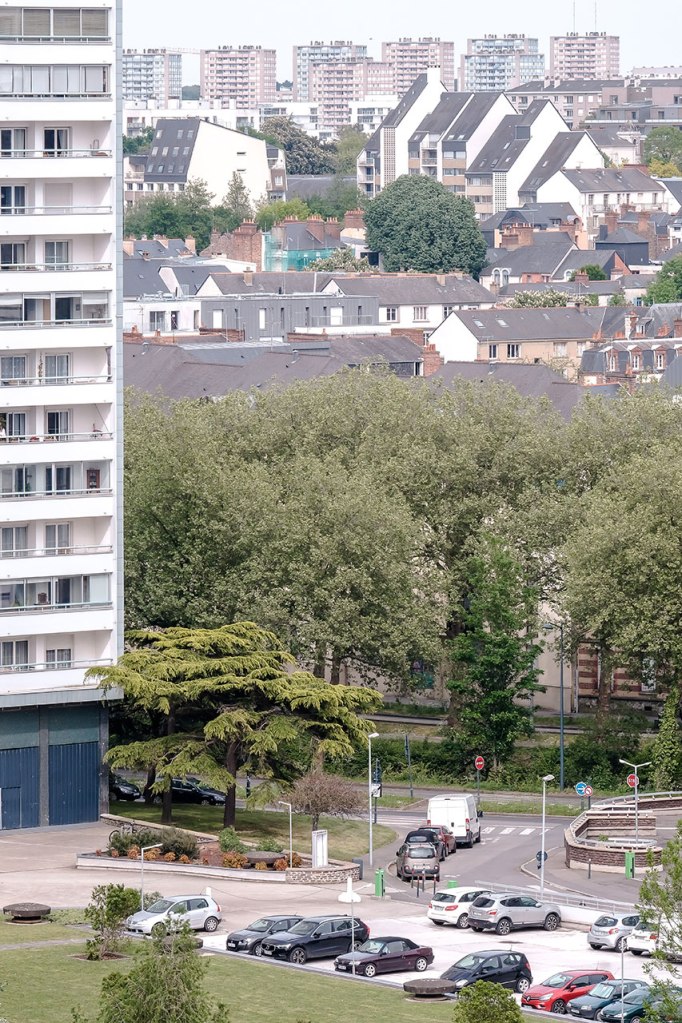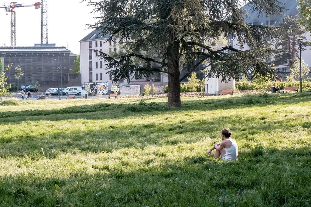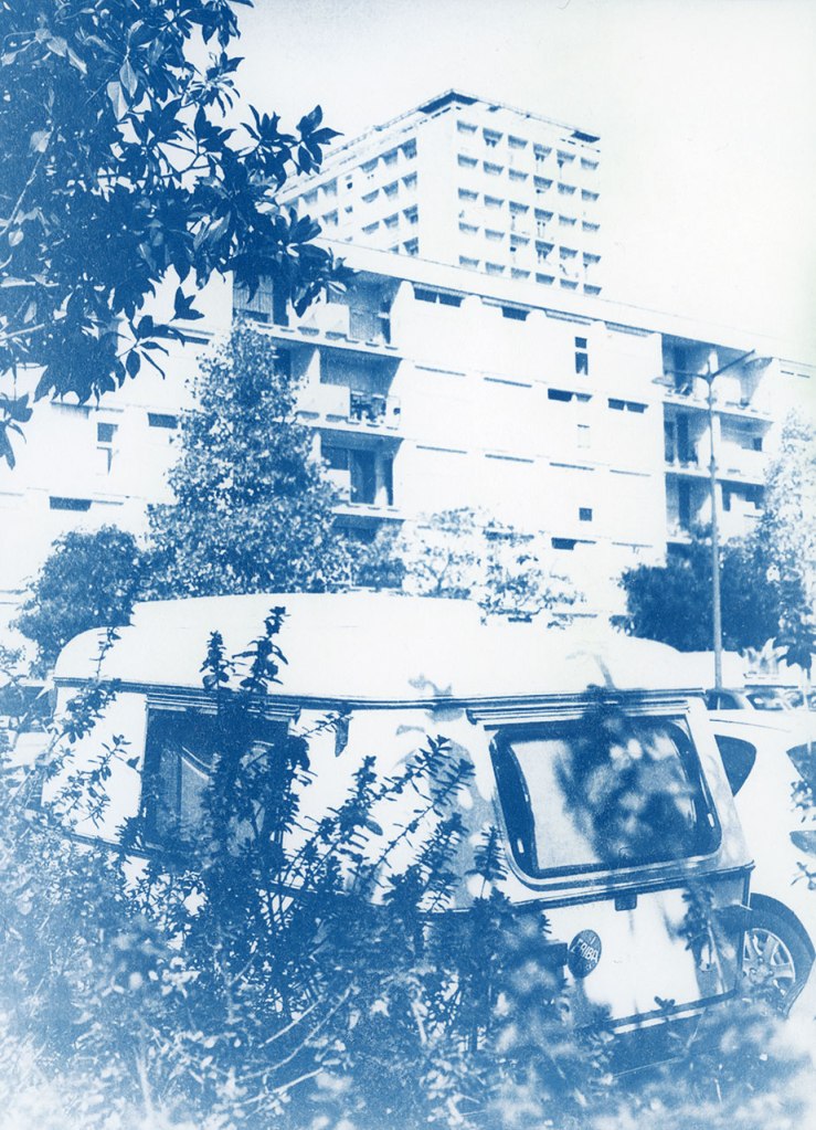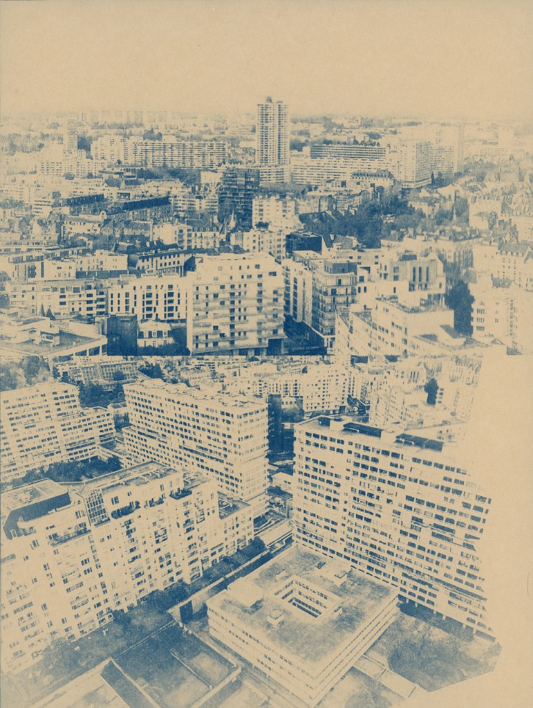 A valeur focale respectant les distances de sécurité sanitaire, toujours. Regarder la lumière, prendre le temps de décomposer une éclaircie. Rendez-vous au Belvédère, shooter la voisine du dernier étage, puis marcher dans les méandres du grand séminaire, découvrir son sous-bois. Repenser à Palerme, un an après, l’arbre a grandi dans le jardin au plus proche de la maison. Observer sous différents angles le quartier, le Penthièvre, encore, Les Horizons, encore, Aller chercher des plantes à infuser chez un voisin, y trouver plus tard un escargot, entre temps rejoindre le rendez-vous photographique avec un voisin pour un deuxième mardi, 16h. Se souvenir de Catane où la banque de Sicile chevauche les ruines antiques. Promener le chien par procuration, rappel d’un propos radiophonique récent, la brigade cynophile pourrait bien être missionnée pour détecter les malades. Réunir deux axes photographiques d’un trentième étage et les tirer ensemble. Croiser un voisin, parler des changements potentiels, croiser des voisines, vider les verres. « Les gens fument, ils achètent un peu de presse mais les gens n’ont plus envie de jouer » dit le buraliste. Croiser des voisins, acheter du pain, croiser une voisine, attendre les légumes. Faire réunion dans la pelouse privée, photographier une voisine et un chat de passage. Faire cyanotype. Faire film avec une collection de coquillages. Les terrasses sont cachées sous bâches, un humain sur pelouse regardant le lointain, un humain sous tente sans doute, les canards incarnant soudain la liberté d’aller et flotter.