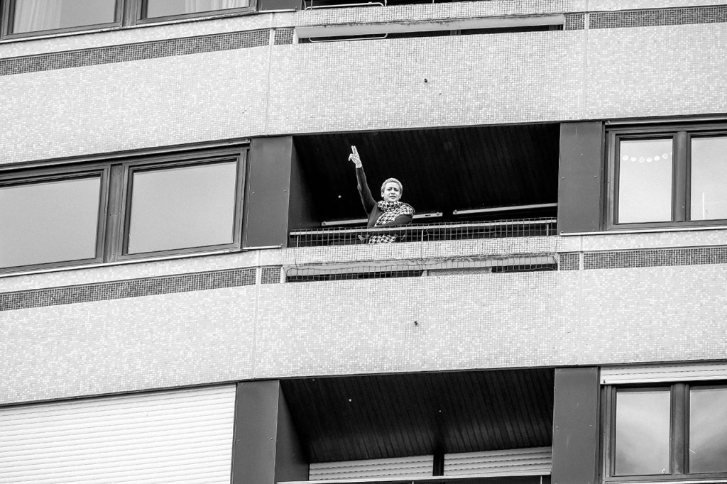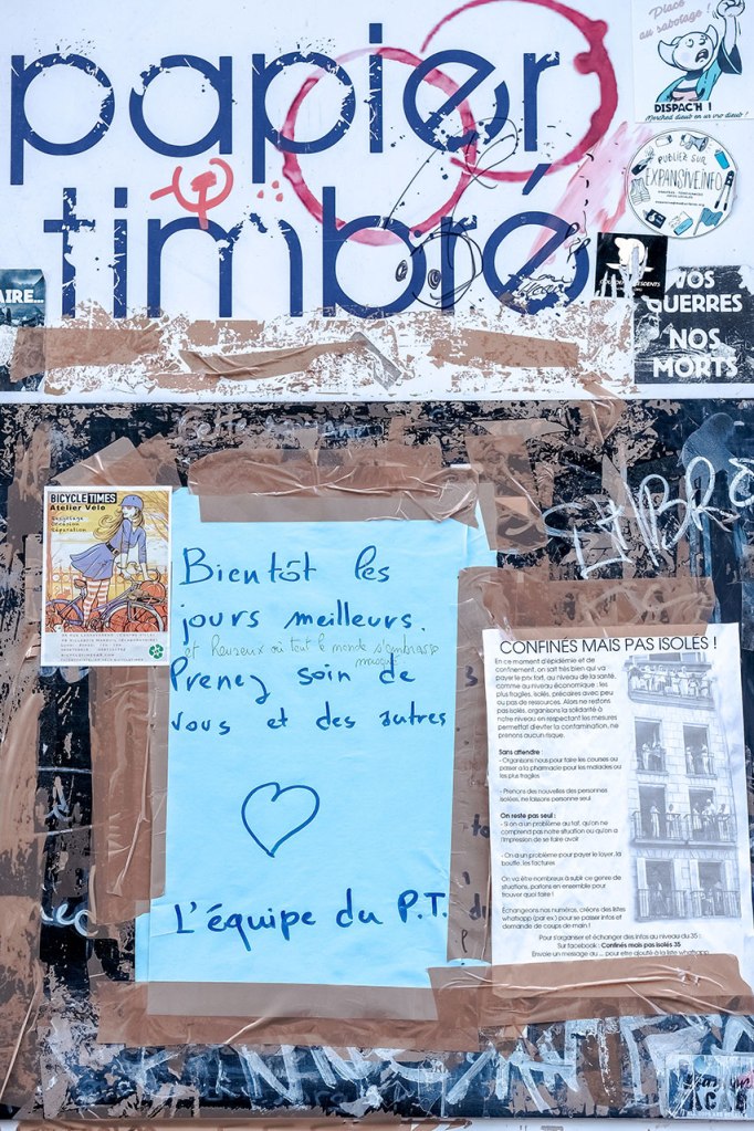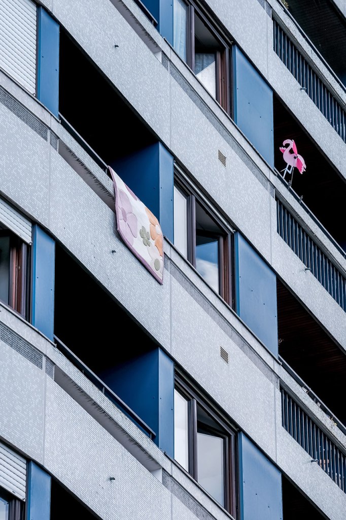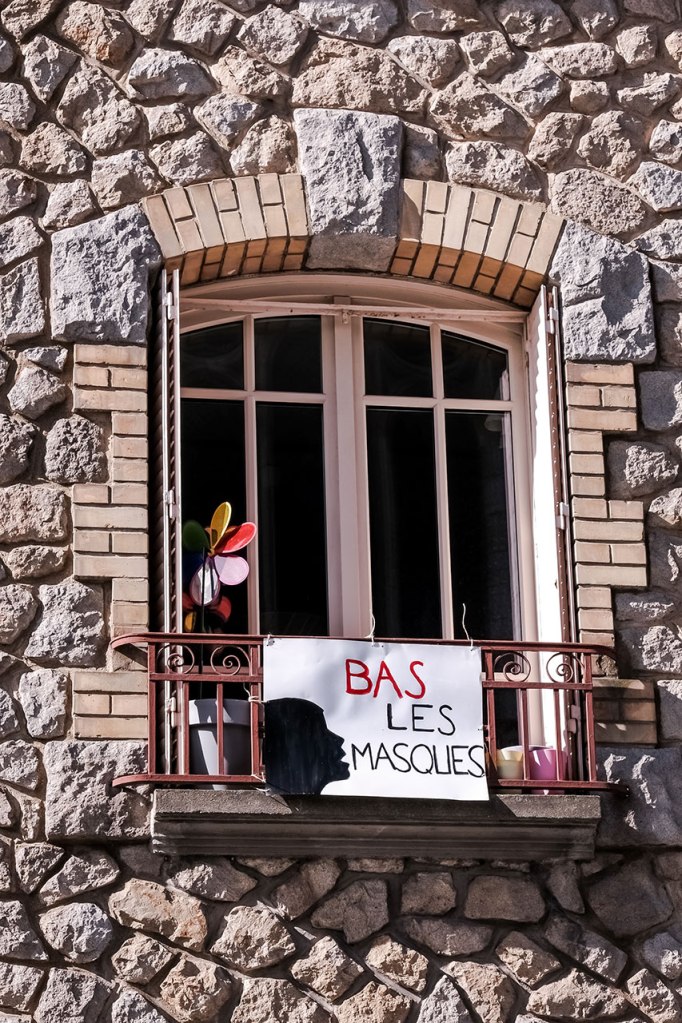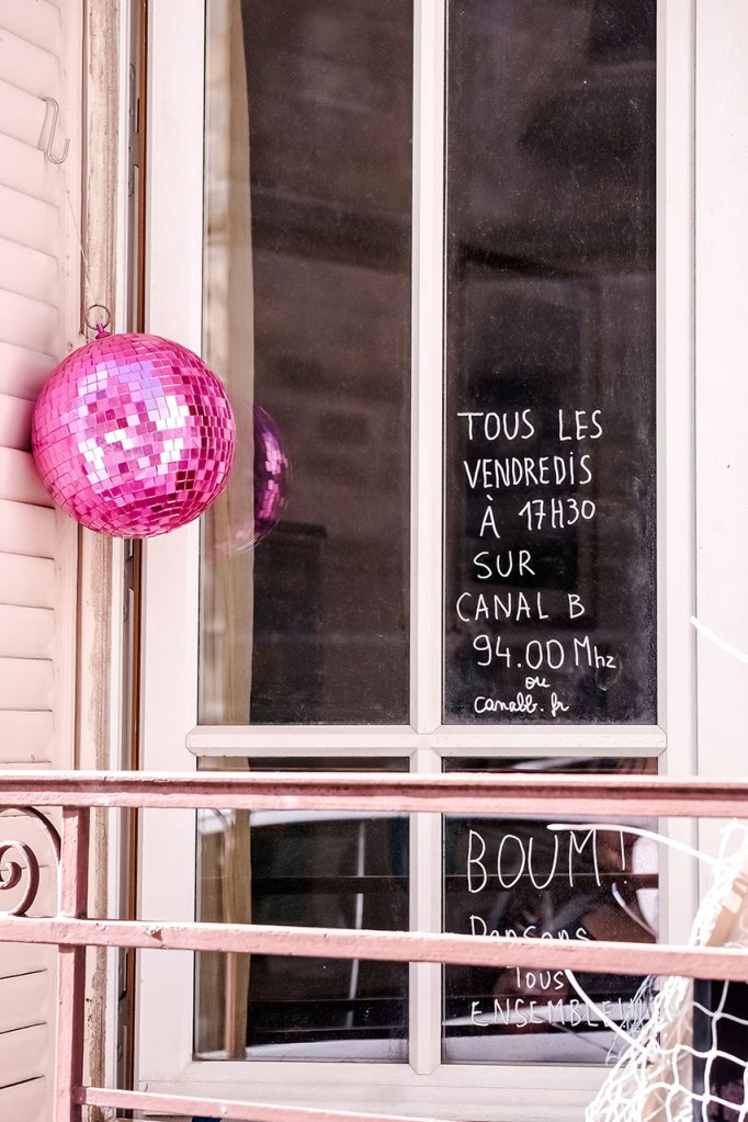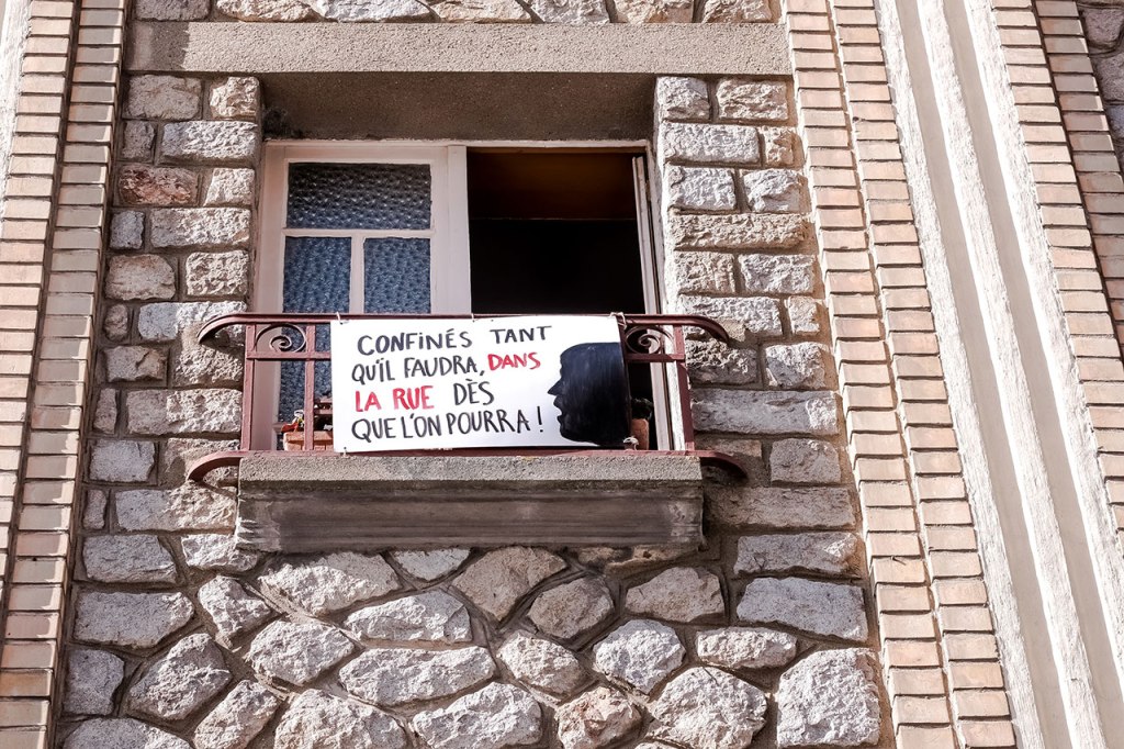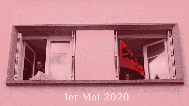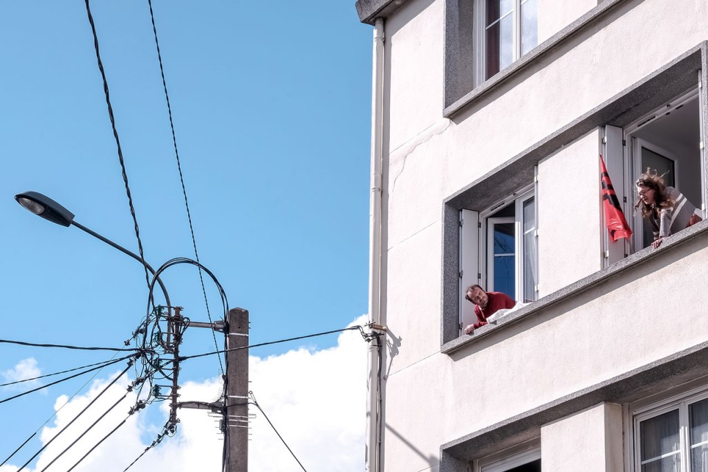 Ce 1er mai, tout est calme, cela n’est jamais arrivé depuis bien longtemps. Balade sur asphalte, l’œil dans les étages à chercher les messages contemporains, suspendus aux fenêtres, aux balcons. Je vais vers mon rendez-vous photographique, repoussé depuis mardi pour cause de météo. Sur le chemin, sans préméditation un voisin lève le poing sur son balcon, et là soudain, sans lien, une voisine lève la main à quelques mètres, belle coïncidence, n’est-ce pas? Merci. Les étoles rouges, les draps écrits, les mots plastifiés racontent un peu, compassionnement. Au rendez-vous, tout se déroule pour le mieux, une mise en scène improvisée parfaite, cela fait gif, aucun doute. Une voisine arrive par le plus grand des hasards, on danserait presque sur le trottoir, et c’est bien comme cela que l’on passe discrètement à la boom du vendredi de 17h30 à 19h, diffusée dans la Crème de la Crème sur Canal B, le rendez-vous dansant de ces dernières semaines. Sur la route, la désolation, la rue de la soif, la place St Anne, la rue St Malo : vides, aucune fête de la paresse, c’est terriblement déroutant de ne pas voir céans plein de gens, heureux en cette journée internationale des travailleuses et des travailleurs. La boule à facette rose prend alors sa place d’objet souvenir, objet d’avenir.