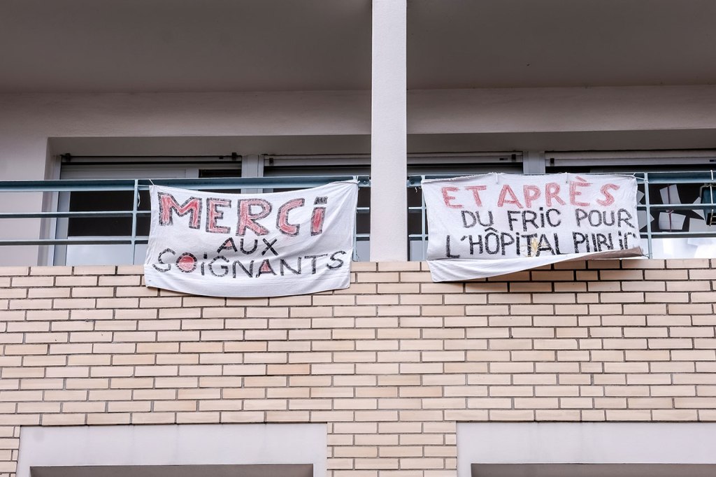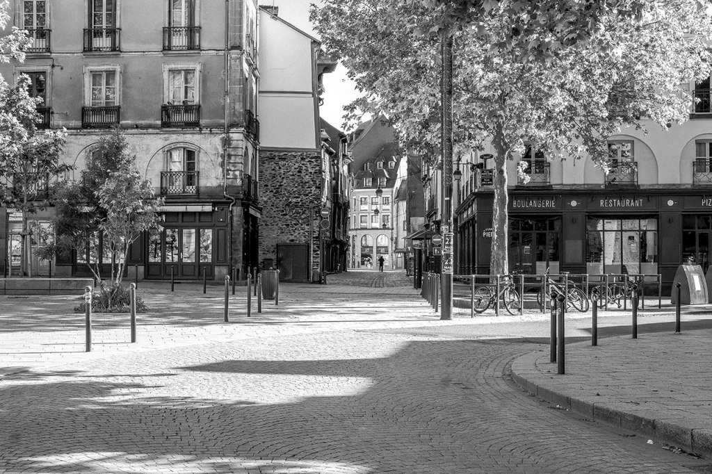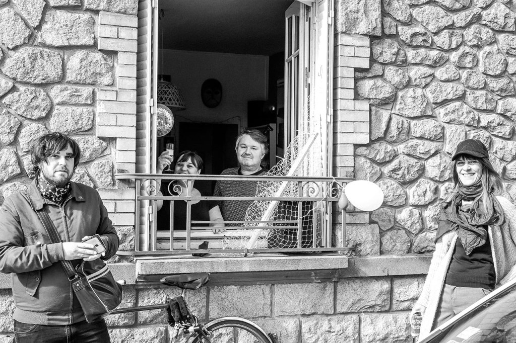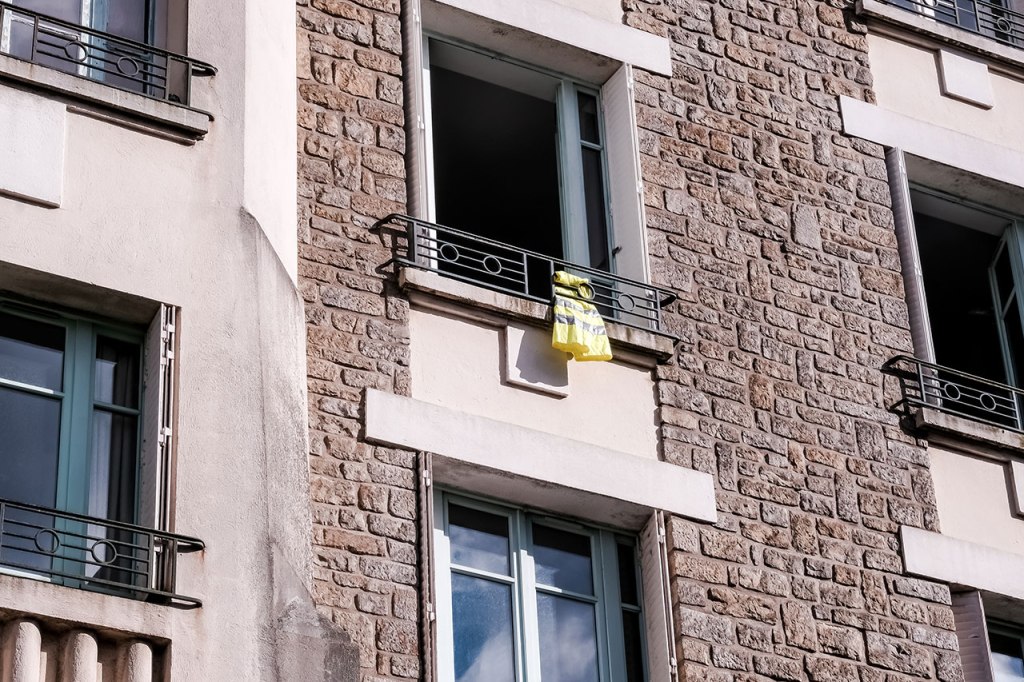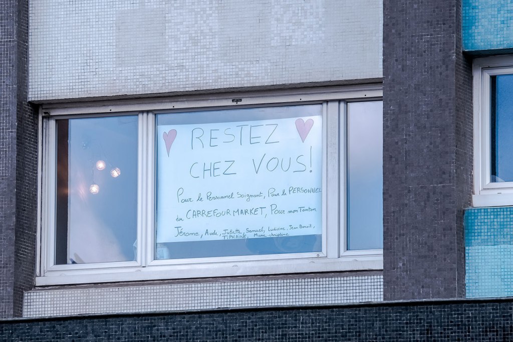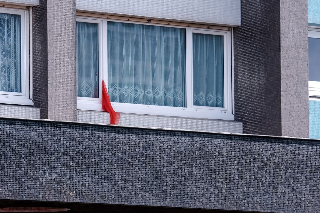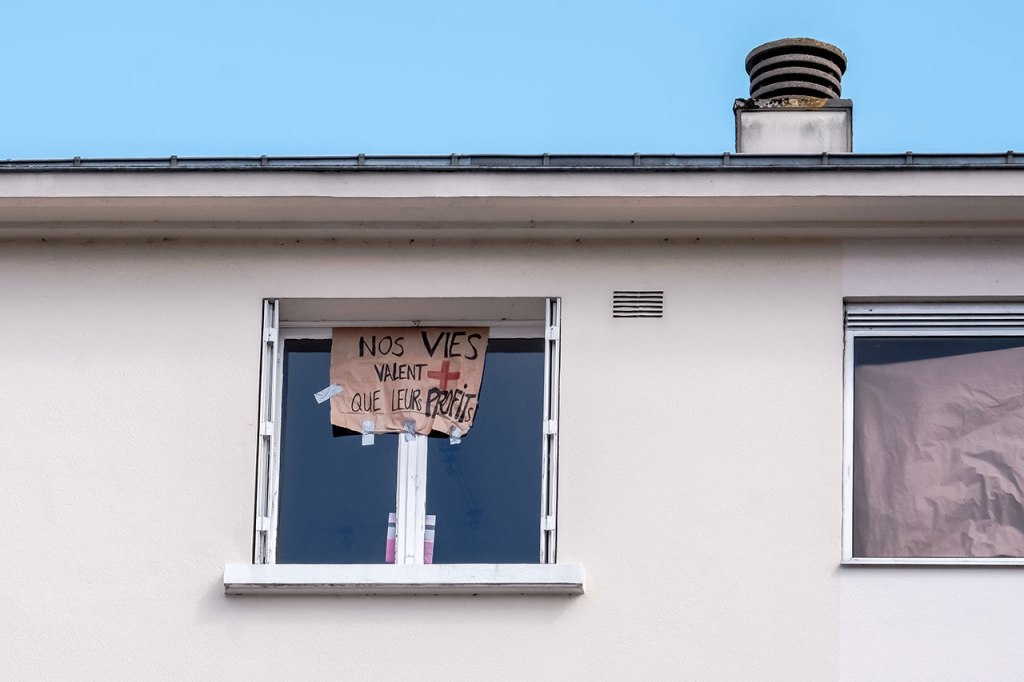 Ce 1er mai, tout est calme, cela n’est jamais arrivé depuis bien longtemps. Balade sur asphalte, l’œil dans les étages à chercher les messages contemporains, suspendus aux fenêtres, aux balcons. Je vais vers mon rendez-vous photographique, repoussé depuis mardi pour cause de météo. Sur le chemin, sans préméditation un voisin lève le poing sur son balcon, et là soudain, sans lien, une voisine lève la main à quelques mètres, belle coïncidence, n’est-ce pas? Merci. Les étoles rouges, les draps écrits, les mots plastifiés racontent un peu, compassionnement. Au rendez-vous, tout se déroule pour le mieux, une mise en scène improvisée parfaite, cela fait gif, aucun doute. Une voisine arrive par le plus grand des hasards, on danserait presque sur le trottoir, et c’est bien comme cela que l’on passe discrètement à la boom du vendredi de 17h30 à 19h, diffusée dans la Crème de la Crème sur Canal B, le rendez-vous dansant de ces dernières semaines. Sur la route, la désolation, la rue de la soif, la place St Anne, la rue St Malo : vides, aucune fête de la paresse, c’est terriblement déroutant de ne pas voir céans plein de gens, heureux en cette journée internationale des travailleuses et des travailleurs. La boule à facette rose prend alors sa place d’objet souvenir, objet d’avenir.