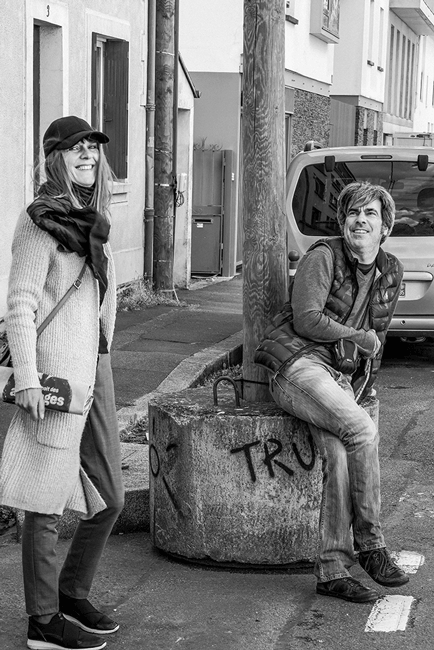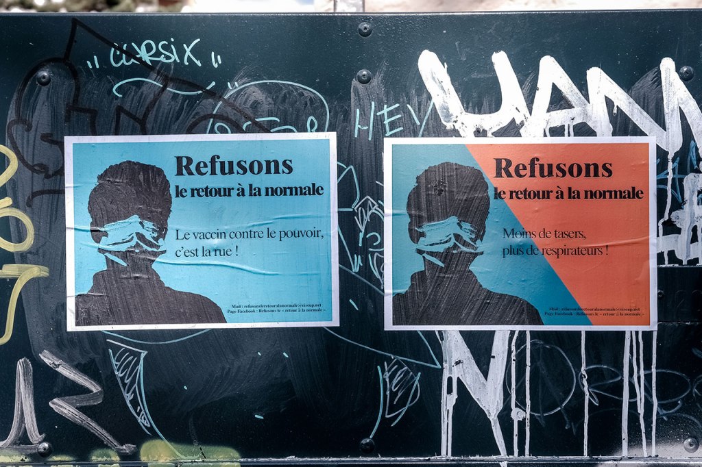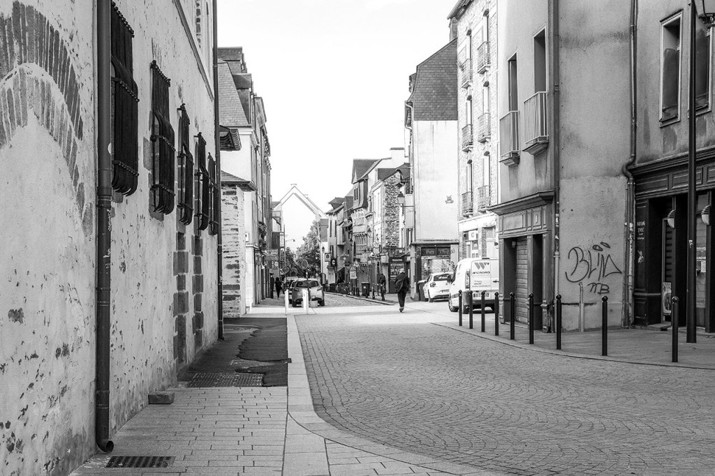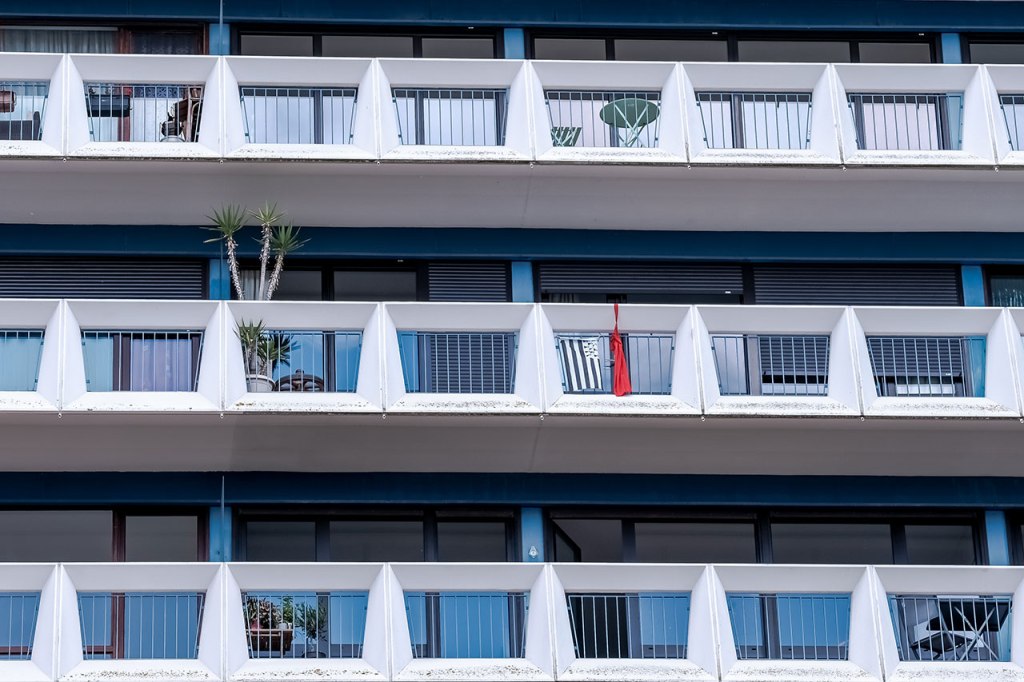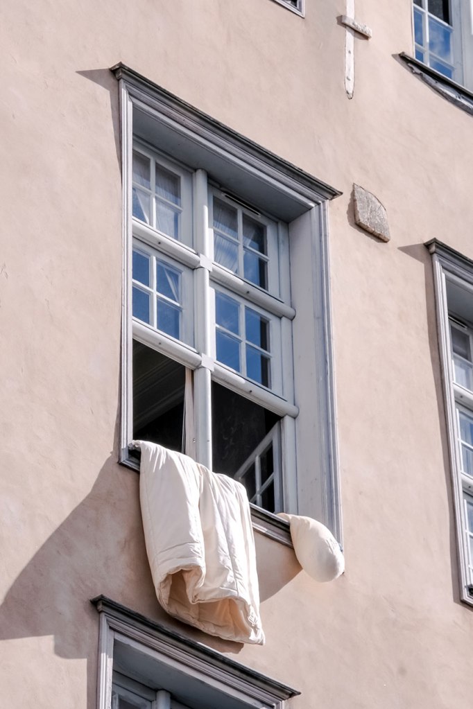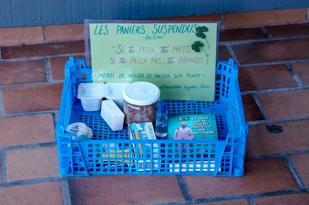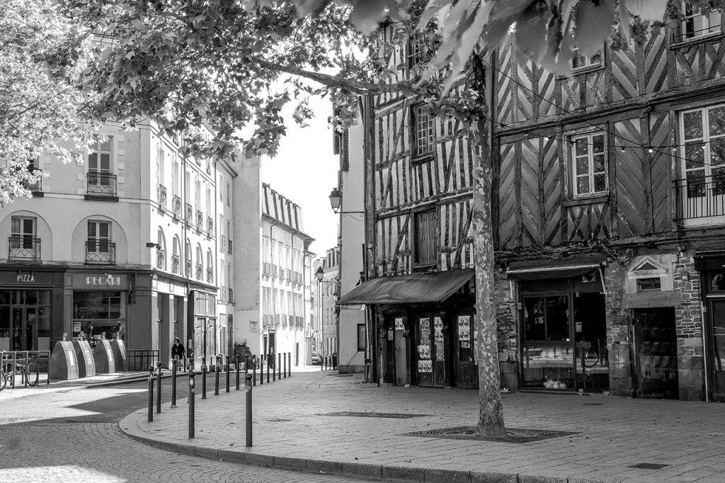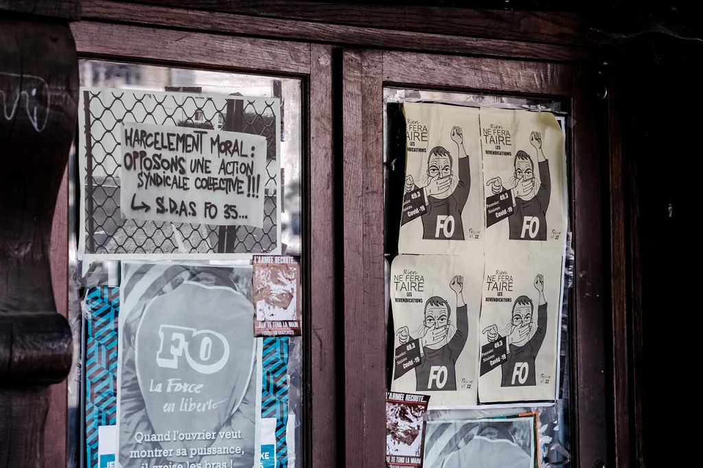 Ce 1er mai, tout est calme, cela n’est jamais arrivé depuis bien longtemps. Balade sur asphalte, l’œil dans les étages à chercher les messages contemporains, suspendus aux fenêtres, aux balcons. Je vais vers mon rendez-vous photographique, repoussé depuis mardi pour cause de météo. Sur le chemin, sans préméditation un voisin lève le poing sur son balcon, et là soudain, sans lien, une voisine lève la main à quelques mètres, belle coïncidence, n’est-ce pas? Merci. Les étoles rouges, les draps écrits, les mots plastifiés racontent un peu, compassionnement. Au rendez-vous, tout se déroule pour le mieux, une mise en scène improvisée parfaite, cela fait gif, aucun doute. Une voisine arrive par le plus grand des hasards, on danserait presque sur le trottoir, et c’est bien comme cela que l’on passe discrètement à la boom du vendredi de 17h30 à 19h, diffusée dans la Crème de la Crème sur Canal B, le rendez-vous dansant de ces dernières semaines. Sur la route, la désolation, la rue de la soif, la place St Anne, la rue St Malo : vides, aucune fête de la paresse, c’est terriblement déroutant de ne pas voir céans plein de gens, heureux en cette journée internationale des travailleuses et des travailleurs. La boule à facette rose prend alors sa place d’objet souvenir, objet d’avenir.