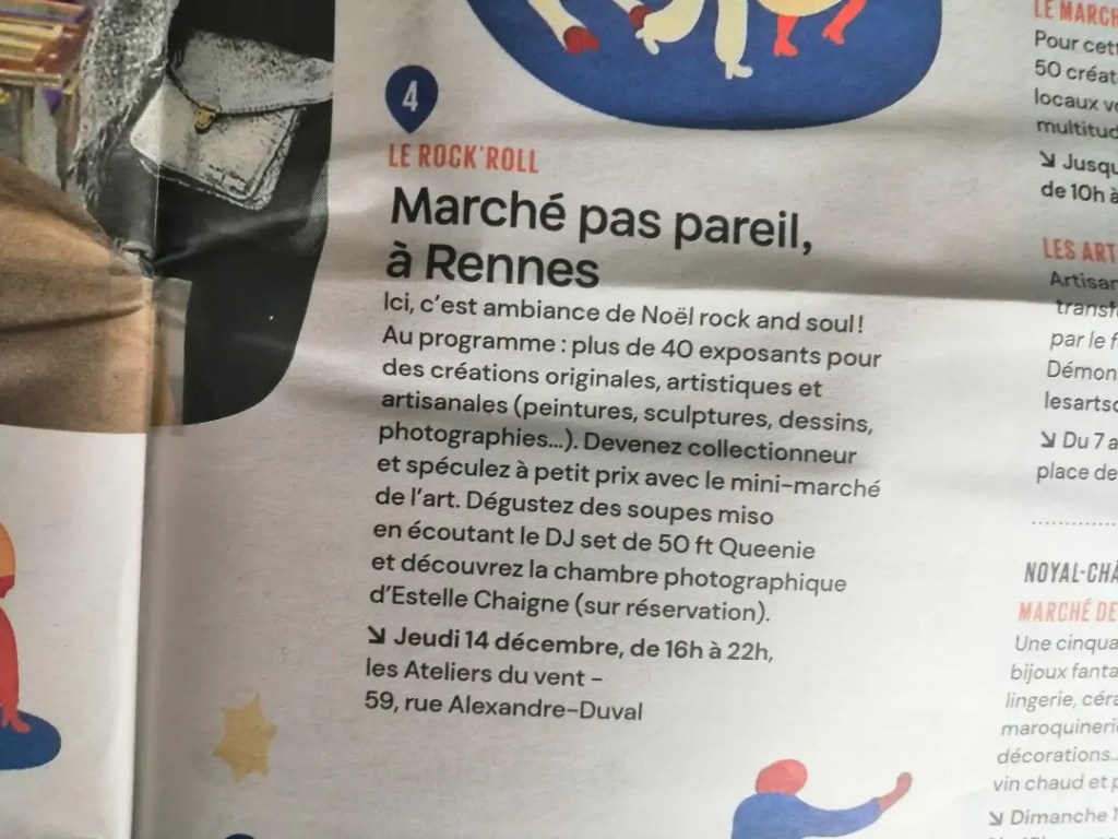 Vous pourrez y dénicher des photographies, des impressions, des dessins, des peintures, de petites sculptures ainsi que des mets délicats. Avec aussi aux Ateliers du Vent un DJ set de 50 ft Queenie, Rock and Soul !