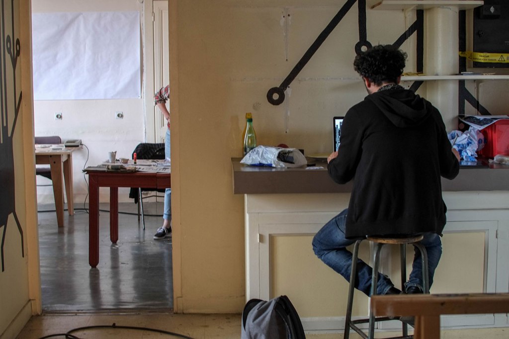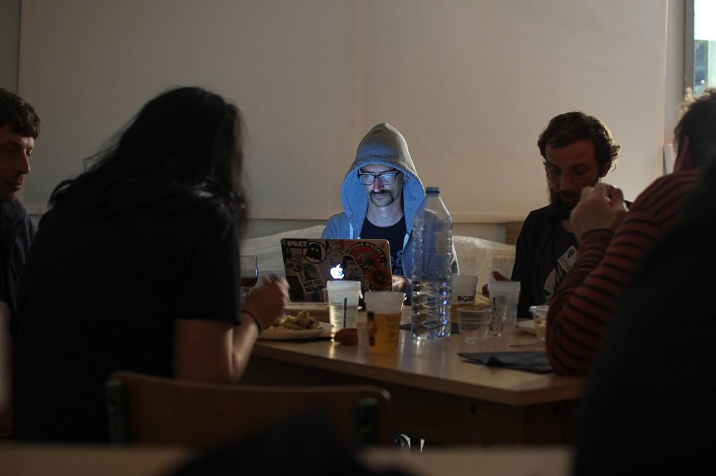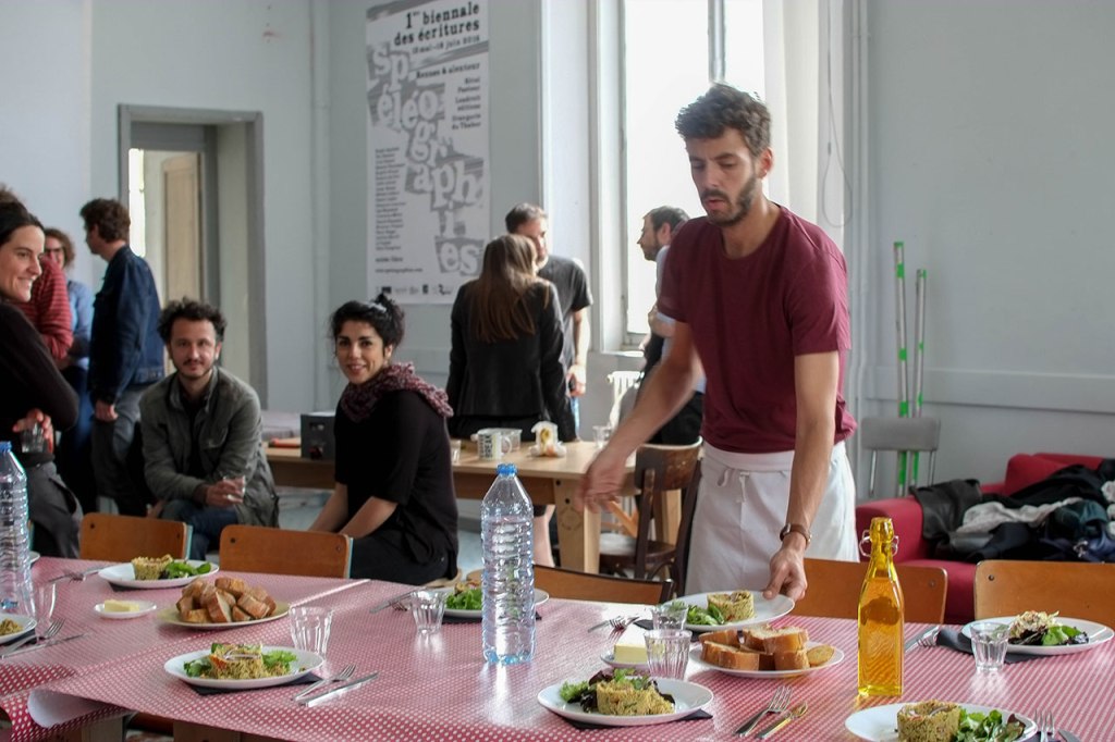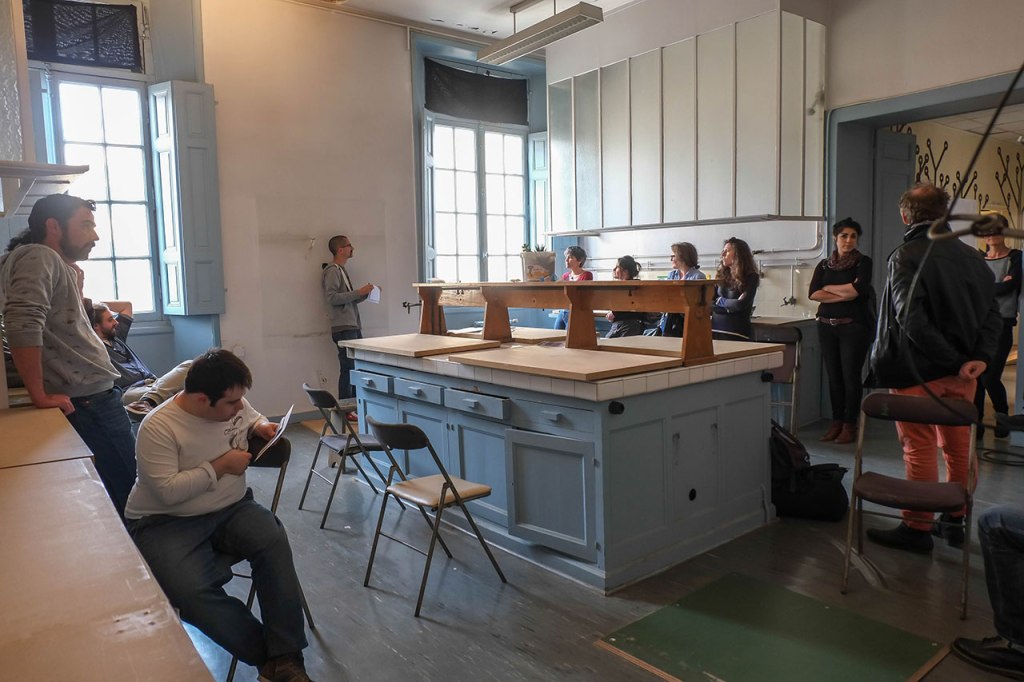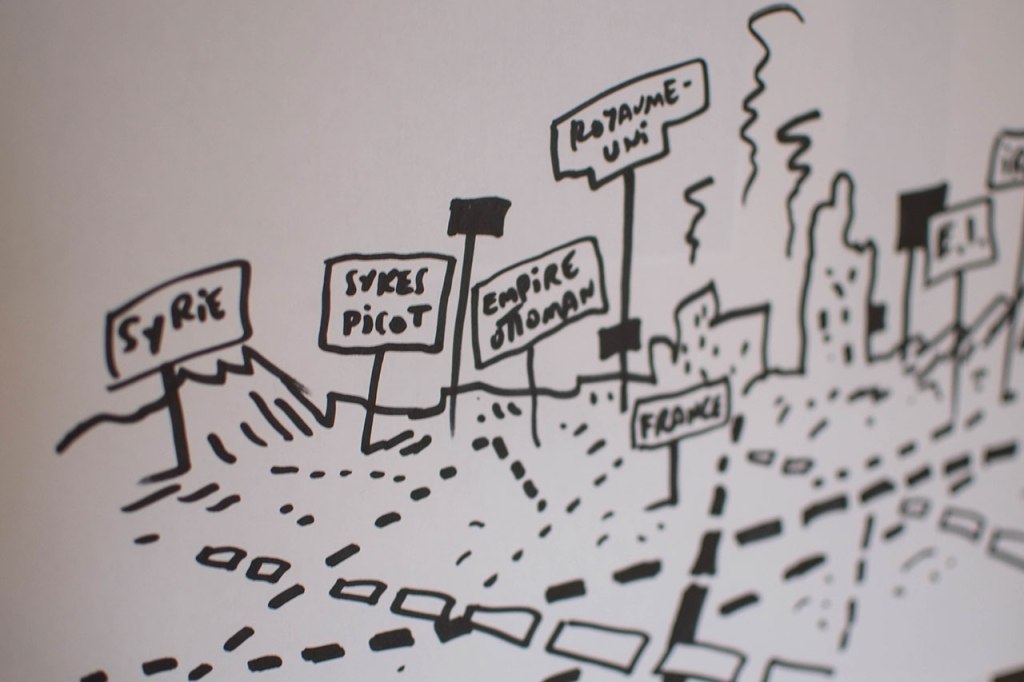 Le labo encore vide, quelques instants avant l’arrivée des laborantins, ils patientent le temps d’un repas dans la grande salle. La thématique est expliquée par Jean Christophe Menu, qui a rejoint l’équipe des laborantins : les accords de Sykes Picot, territoires, frontières et bien d’autres possibles.