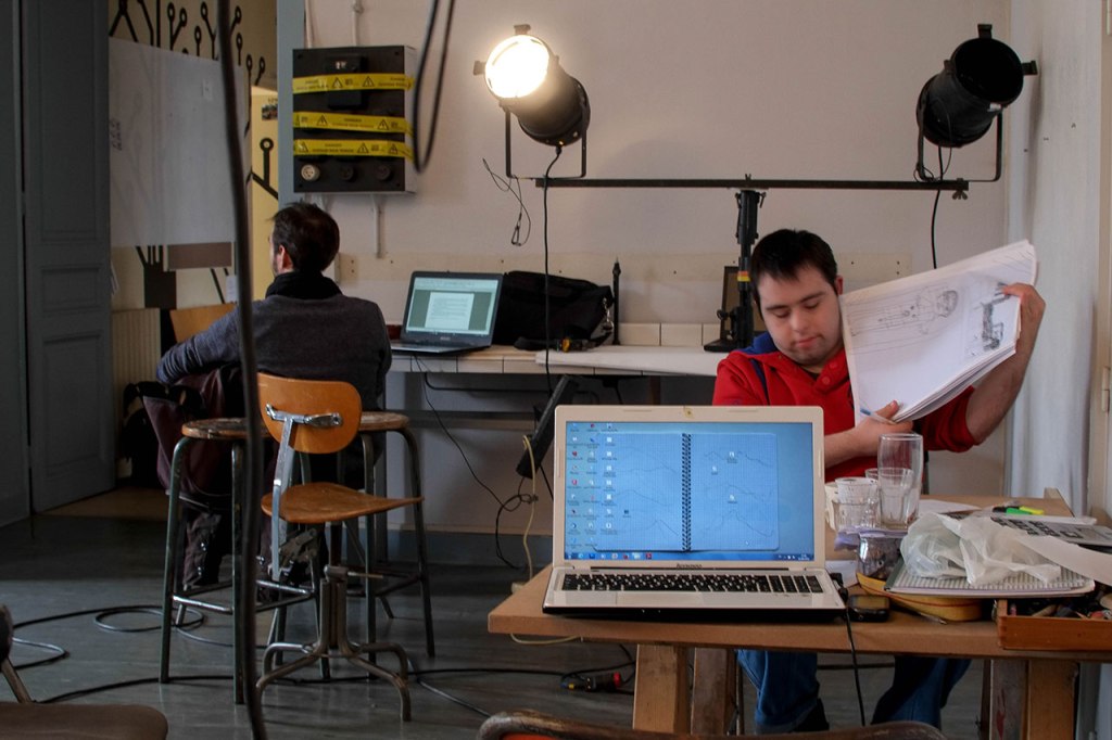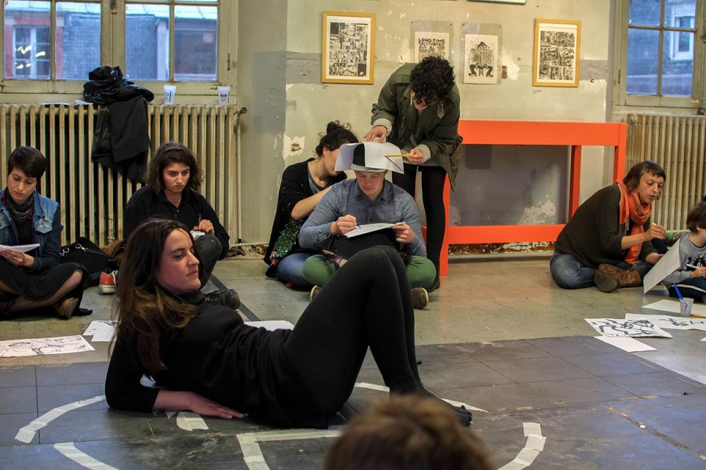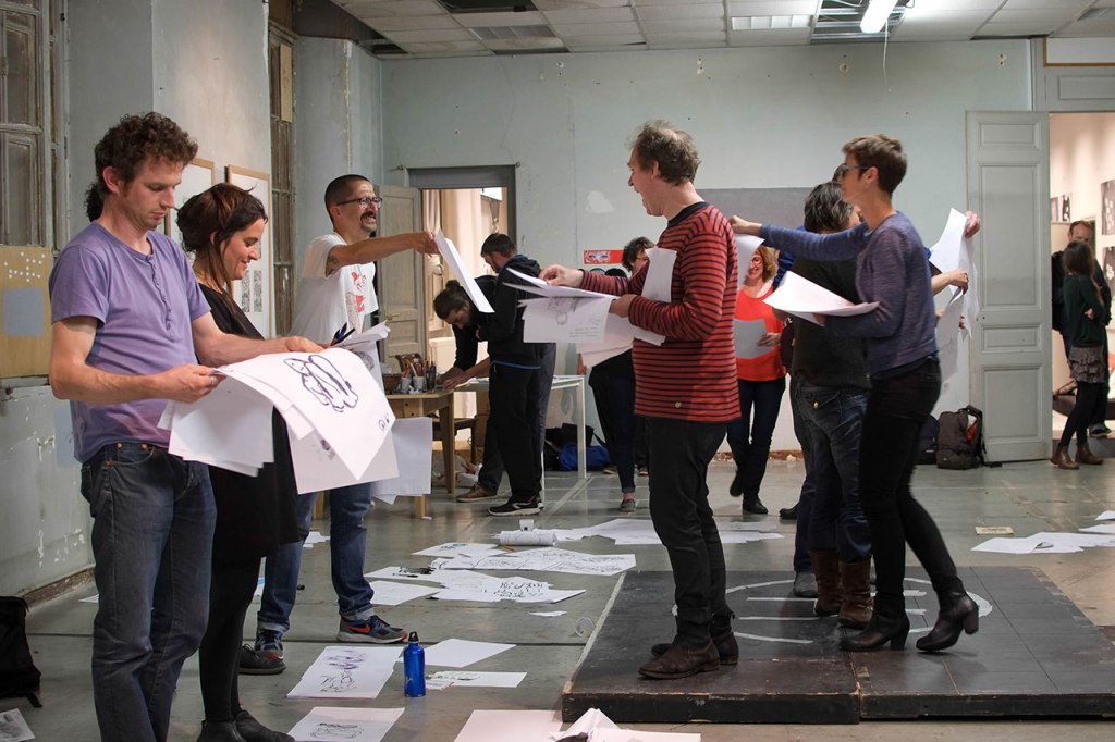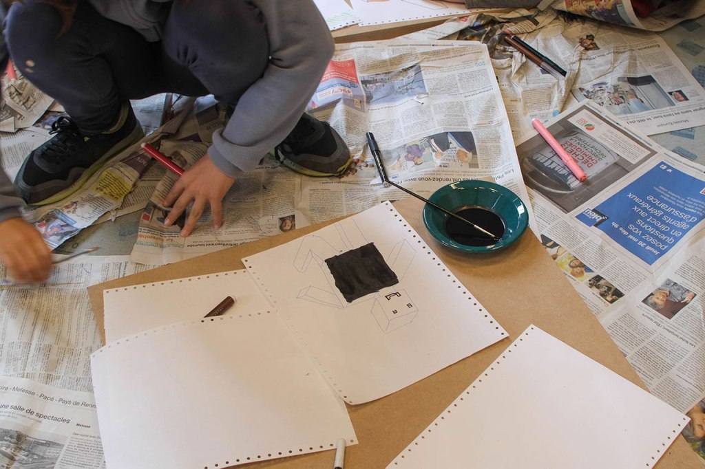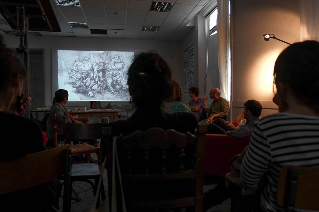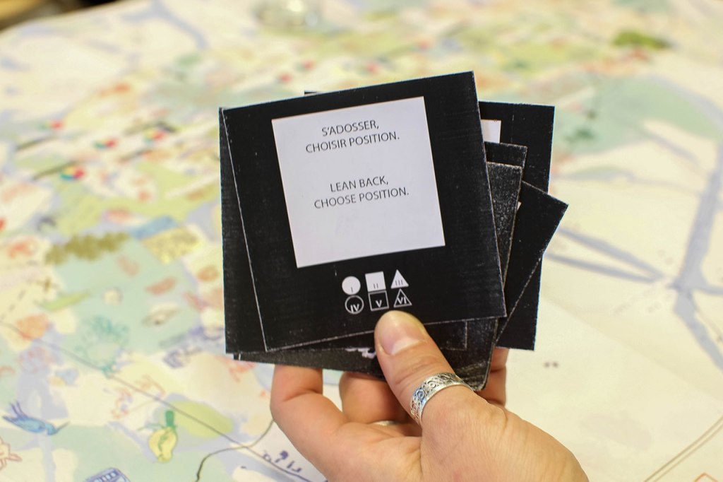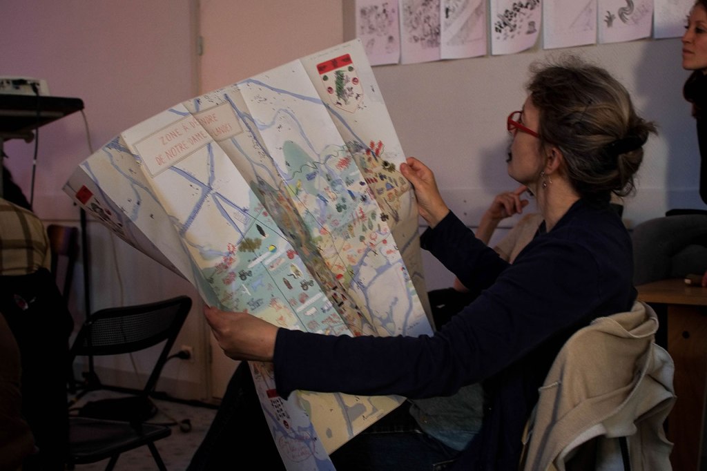 Les laborantins se placent dans le labo, à l’écoute de Mathilde et June de Chifoumi qui leur proposent des exercices pour se mettre en mains, et entrer en contact. Sébastien Lumineau, chargé de mise en page, montre le gabarit de travail. En fin d’après midi, les premiers territoires se dessinent.