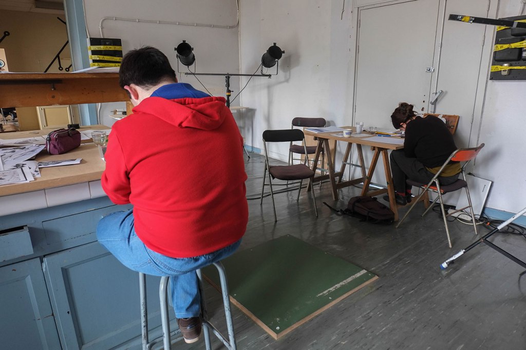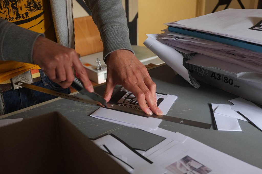 Julie Doucet écrit ses légendes avant le vernissage. Jérôme a installé la librairie. Le vernissage aura bien lieu, malgré les aléas, avec une autorisation de 18h30 à 20h30 de recevoir le public. C’est court mais il y a une bonne ambiance!
