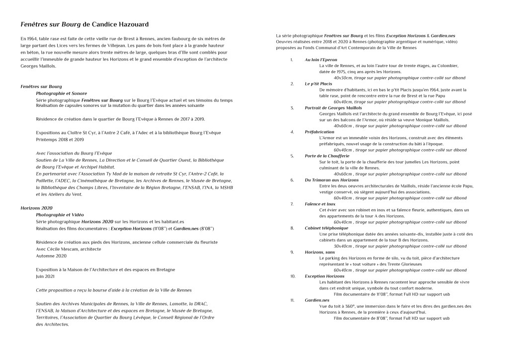 En 2024, le Fonds communal d’art contemporain de la Ville de Rennes fait l’acquisition de neuf photographies et deux films courts, réalisés lors des résidences Fenêtres sur Bourg et Horizons 2020.