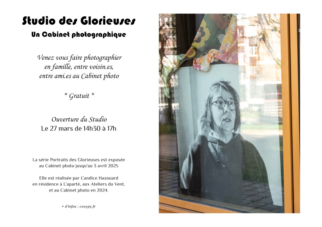 La série Portraits des Glorieuses est exposée au Cabinet photo jusqu’au 3 avril prochain, avec un temps de rencontre le 5 mars à 16h30, et un temps de studio ouvert à tous le 27 mars.