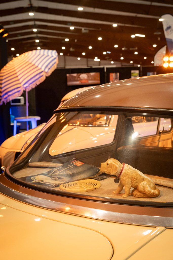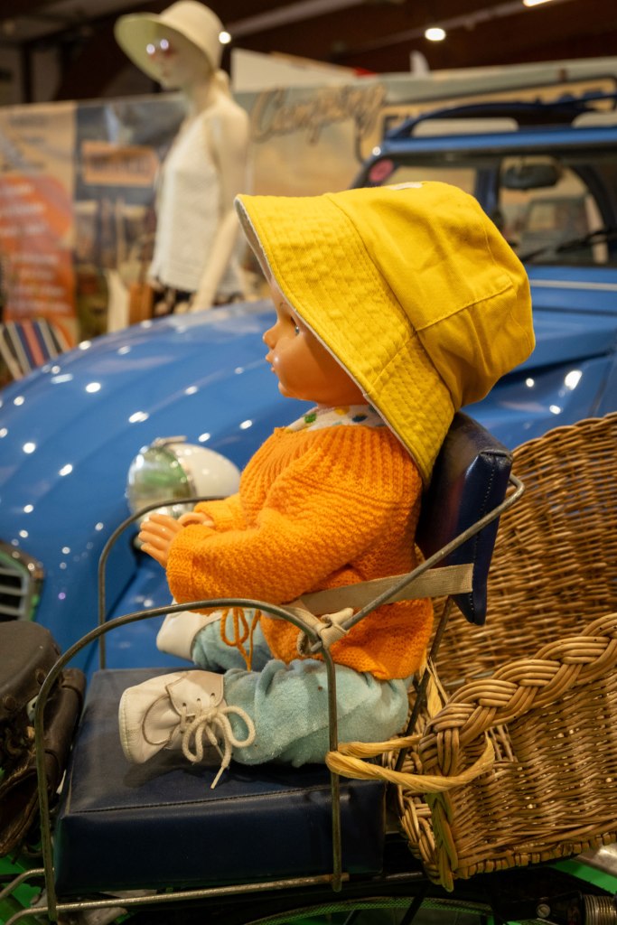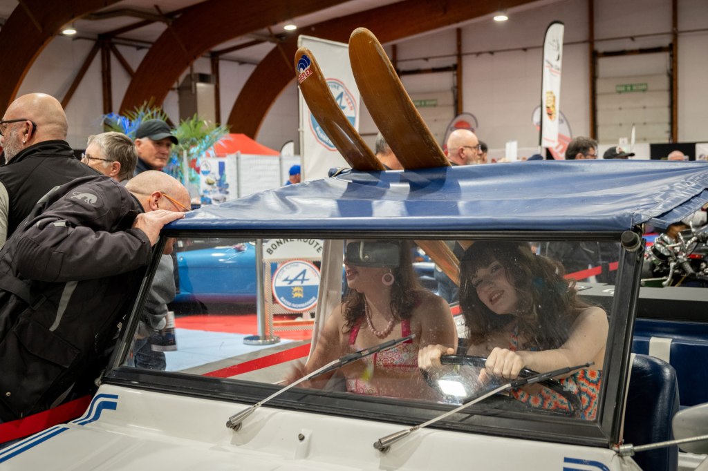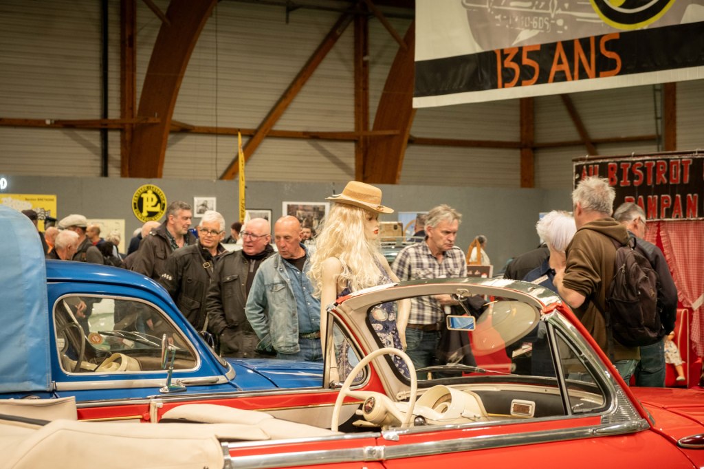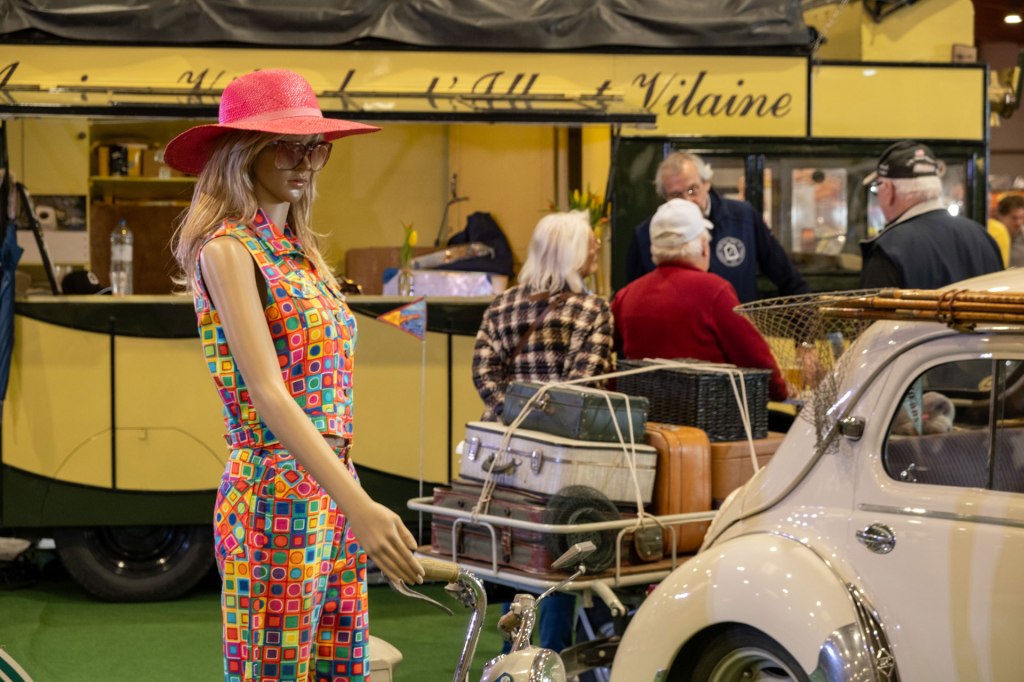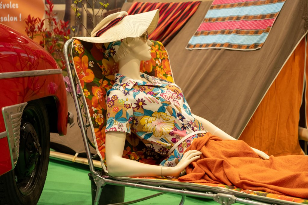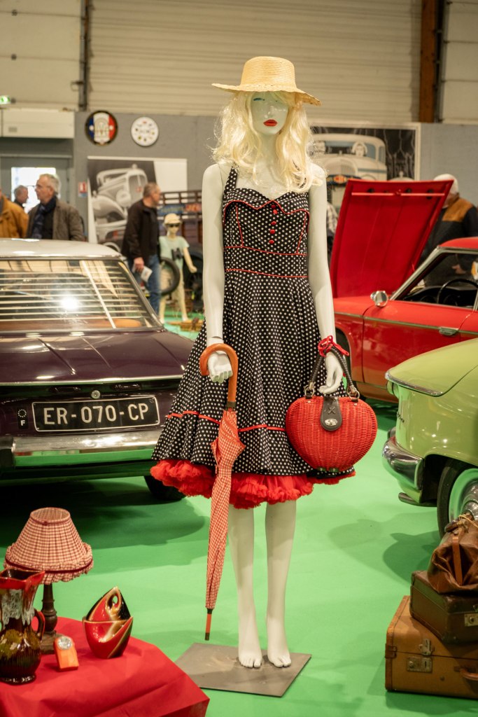 Samedi, j’ai arpenté pour la première fois le très fréquenté salon Retro Passion, telles des Transmobiles au Parc Expos de Rennes. Alors ici là, j’ai été médusée par les mises en scènes déployées pour mettre en lumière les autos ; toutes ces mannequins s’étaient données rendez-vous pour porter hauts les cœurs les couleurs des congés payés.