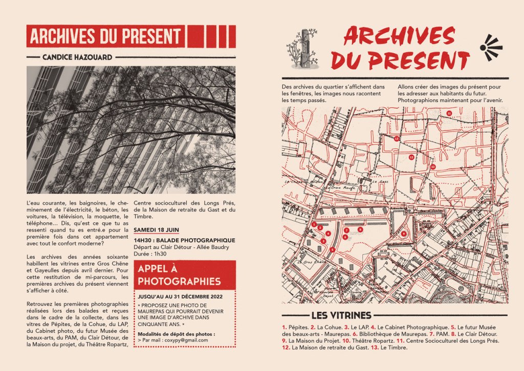 Les photographies Archives du présent sont exposées chez Pépites et au Pôle associatif de la Marbaudais (PAM) du 2 juin au 7 juillet 2023, aussi à la Maison du Projet, à la Bibliothèque de Maurepas, au Centre Socio-culturel des Longprès, au Timbre de Maurepas, dans l’Allée Alexandre Lefas et sur les murs du l’Espace Social Commun du Gros Chêne. Le vernissage au PAM s’est tenu le 8 juin 2023 à 16h30, la visite guidée a eu lieu le 16 juin 2023 à 16h30.