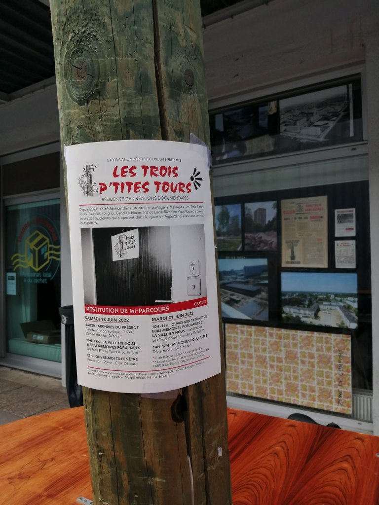Trois P’tites Tours : trois créations documentaires à Maurepas : Depuis novembre 2020, trois artistes-auteures travaillent autour des mutations qui s’opèrent dans le quartier. Laëtitia Foligné, Candice Hazouard et Lucie Rivoalen seront en résidence à Maurepas en 2021. Elles viendront régulièrement lors des deux années à venir (2022 / 2023) pour saisir l’évolution du paysage urbain et ses effets sur les personnes qui l’habitent.