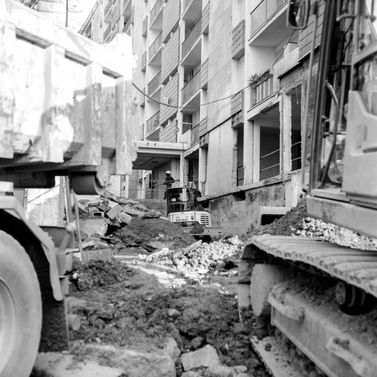 Ci-dessous, quelques photos numériques en noir et blanc en attendant les sels d’argent : des chantiers dans tout Maurepas à Rennes, un local en immersion au dessus de l’ancienne Poste du Gast, une réflexion autour d’un parcours de photographies d’archives, la recherche de témoignages sur les années 1960/70 dans le quartier, l’expérimentation d’un boitier argentique moyen format, des rencontres avec la street artiste Zone de Confort et la photographe Nelly Kerfanto, des lectures de magazines Best datés de 1973…